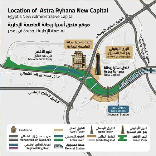 يحيط بفندق استرا ريحانة العاصمة الإدارية astra ryhana new capital مجموعة من اهم المعالم والمحاور الرئيسية داخل العاصمة الادارية الجديدة، مما يعزز من قوة موقعه ويجعله من اكثر المشروعات تميزا في المنطقة.