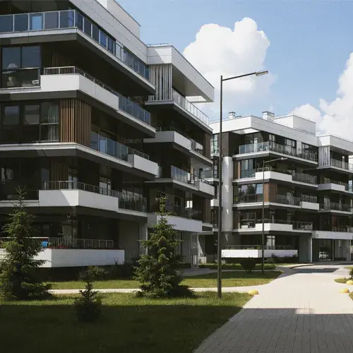 كما اهتم المصمم بواجهات المباني وألوانها التي جاءت عصرية وهادئة، مع توفير مساحات بينية تضمن الخصوصية والهدوء.