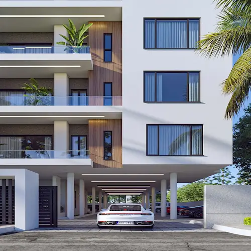 الواجهات الخارجية للمباني صممت بطراز معماري حديث يجمع بين الأناقة والبساطة مع استخدام خامات عالية الجودة تضيف لمسة فاخرة وتضمن استدامة وجمال المظهر الخارجي لسنوات طويلة.
