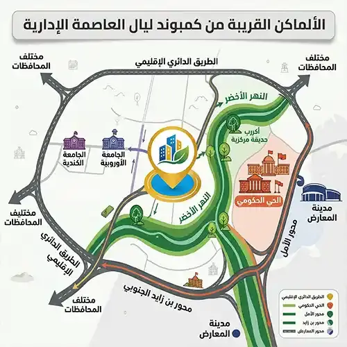 • كمبوند ليال العاصمة الإدارية على مسافة قصيرة من محور بن زايد الجنوبي.