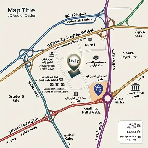 موقع كمبوند ليفتي فيلاز الشيخ زايد livity villas new zayed المميز جعله محيط بمجموعة من أهم الطرق والمعالم التي تسهل حياة السكان اليومية وتتمثل في التالي: