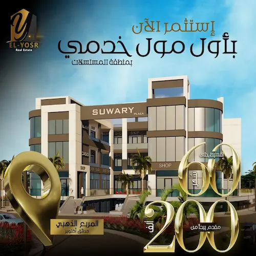 من أبرز إنجازات شركه اليسر للاستثمار العقاري مشروع سواري بلازا مول suwary plaza mall في قلب حدائق أكتوبر والذي يعتبر أول مول خدمي متكامل في المربع الذهبي مصمم ليخدم أكثر من 20,000 ساكن ويضمن تدفق مستمر للعملاء على مدار العام.