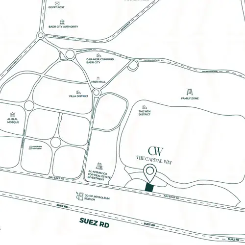 في موقع حيوي في مدينة بدر تم إنشاء ذا كابيتال واي مول the capital way mall ليقدم من خلاله الأنشطة التجارية والإدارية والطبية لجميع العملاء المحيطين به، حيث الحركة المستمرة حوله لوجوده على طريق السويس مباشرة وهذا يجعله محاط بالكثير من الأماكن المهمة والطرق الرئيسية والخدمات التي تعود عليه بالنفع.