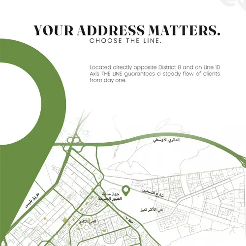 يوجد حول the line mall الكثير من الأماكن المميزة التي تزيد من قيمة المشروع عقاريًا ويحقق لهم مستوى الكثافة السكانية التي تحقق بيئة العمل المطلوب، وهي: