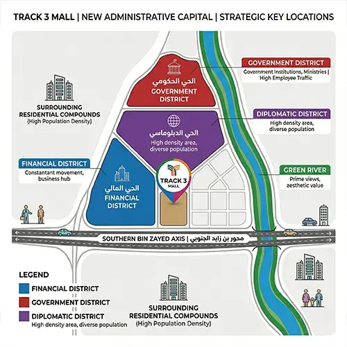 يمثل وقوع مول تراك 3 العاصمة الإدارية track 3 mall في R3 الواقعة في قلب العاصمة الإدارية الجديدة أهم ميزة تنافسية يتمتع بهاالمشروع،